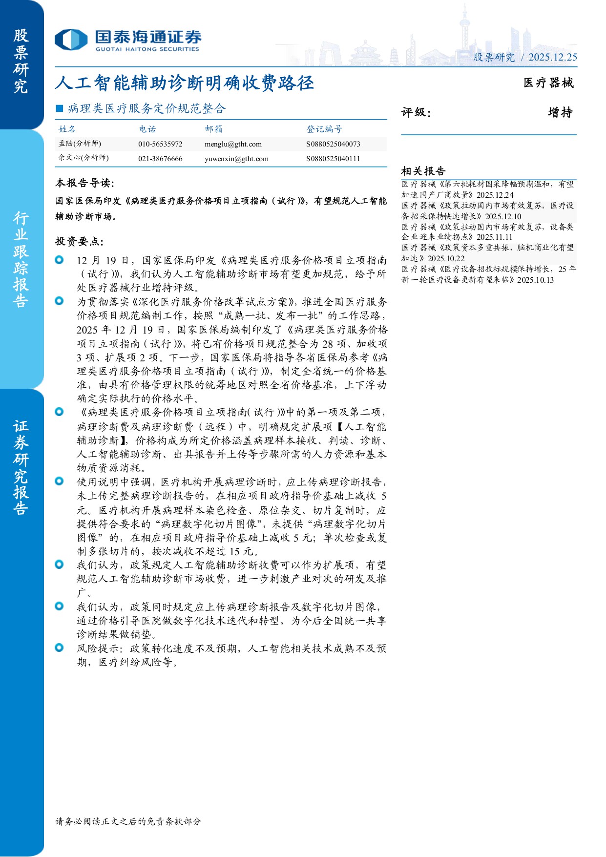 医疗器械行业病理类医疗服务定价规范整合人工智能辅助诊断明确收费路径-2512252页.pdf